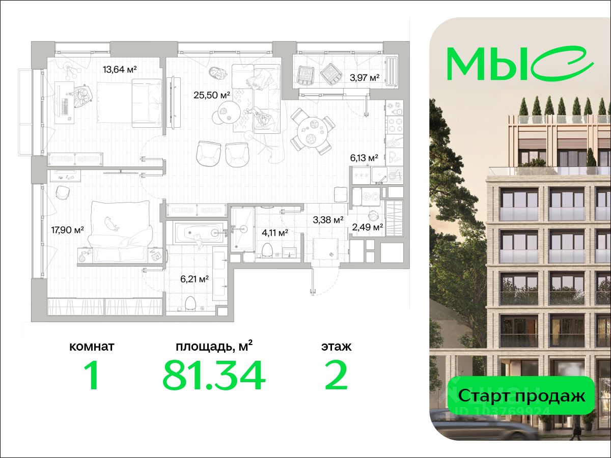 В продаже квартира площадью 81.34 кв. м без отделки на 2 этаже 8 этажного дома. Квартира находится в премиальном жилом комплексе ''МЫС'' (Застройщик - MR Group).