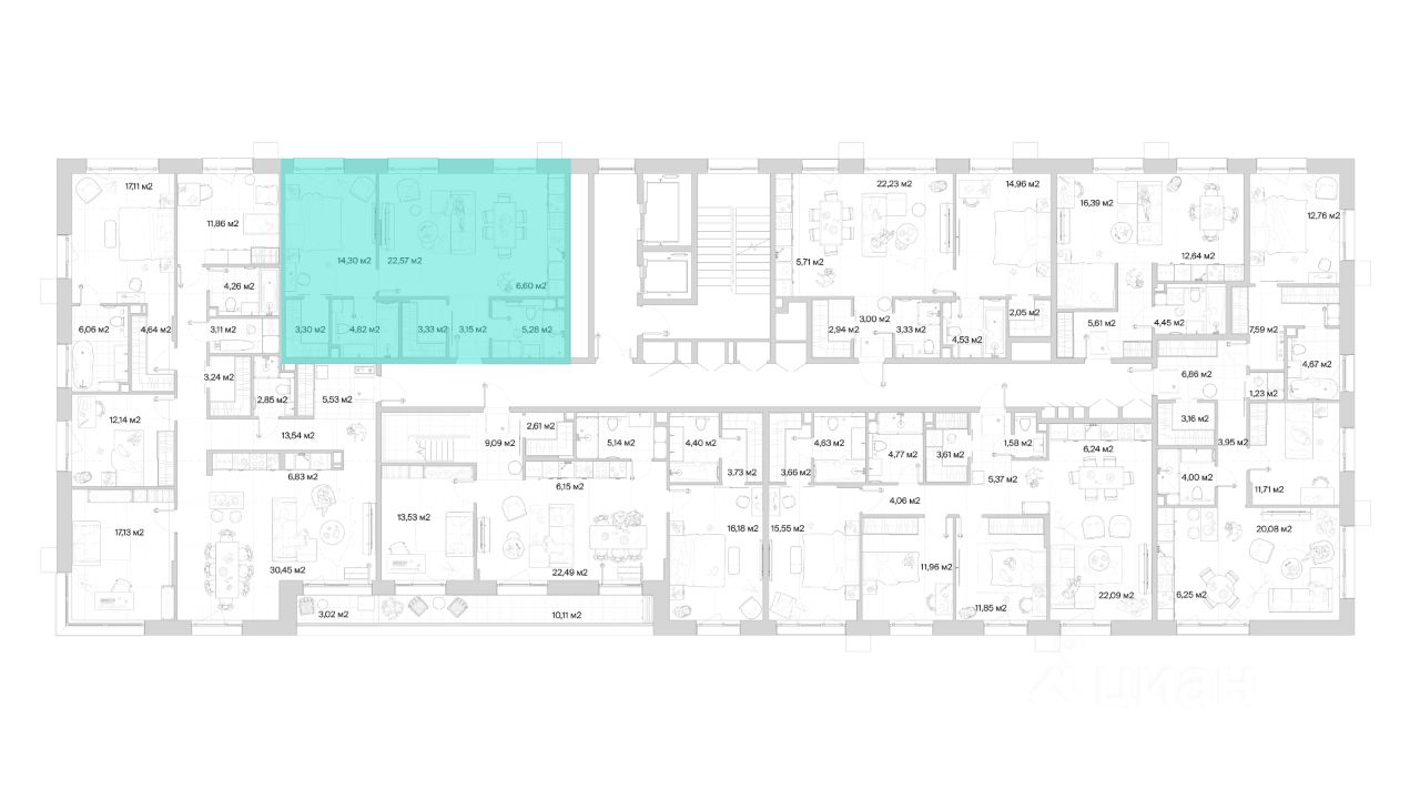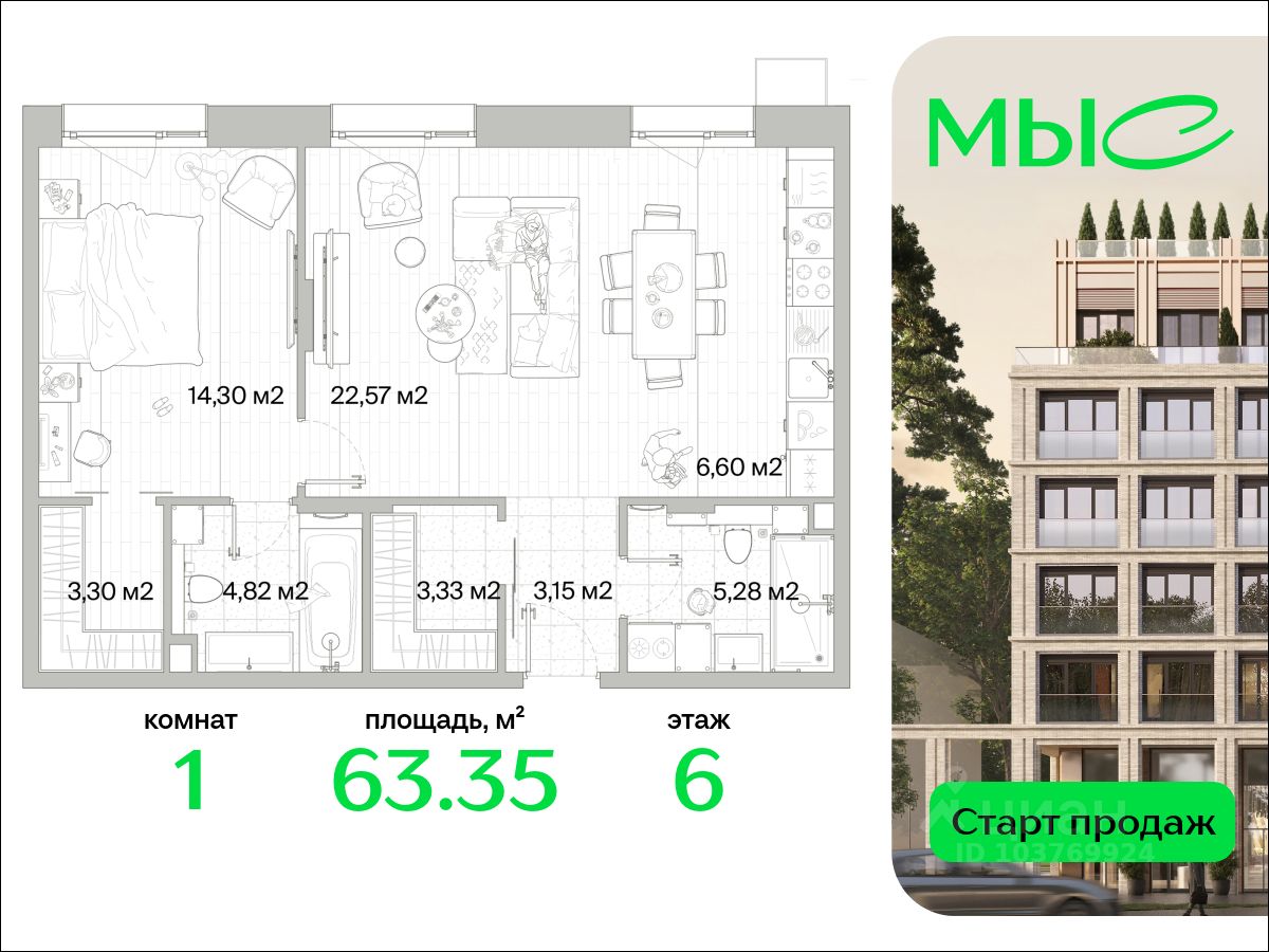 В продаже квартира площадью 63.35 кв. м без отделки на 6 этаже 10 этажного дома. Квартира находится в премиальном жилом комплексе ''МЫС'' (Застройщик - MR Group).
